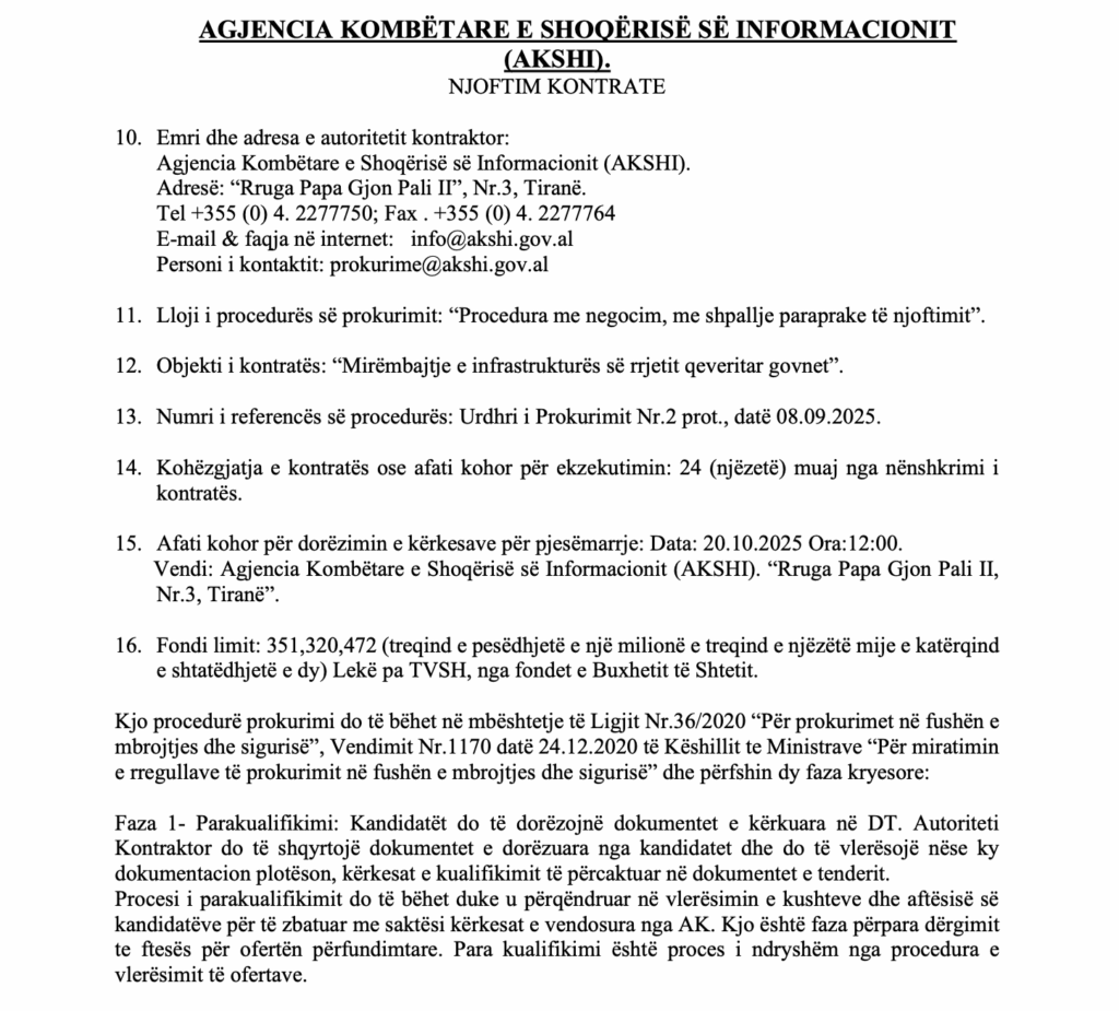 Agjencia Kombëtare e Shoqërisë së Informacionit (AKSHI) ka shpallur një tender me vlerë mbi 351 milionë lekë pa TVSH, ose rreth 3.6 milionë euro, për mirëmbajtjen e infrastrukturës së rrjetit qeveritar “GovNet”, raporton skyweb.al.