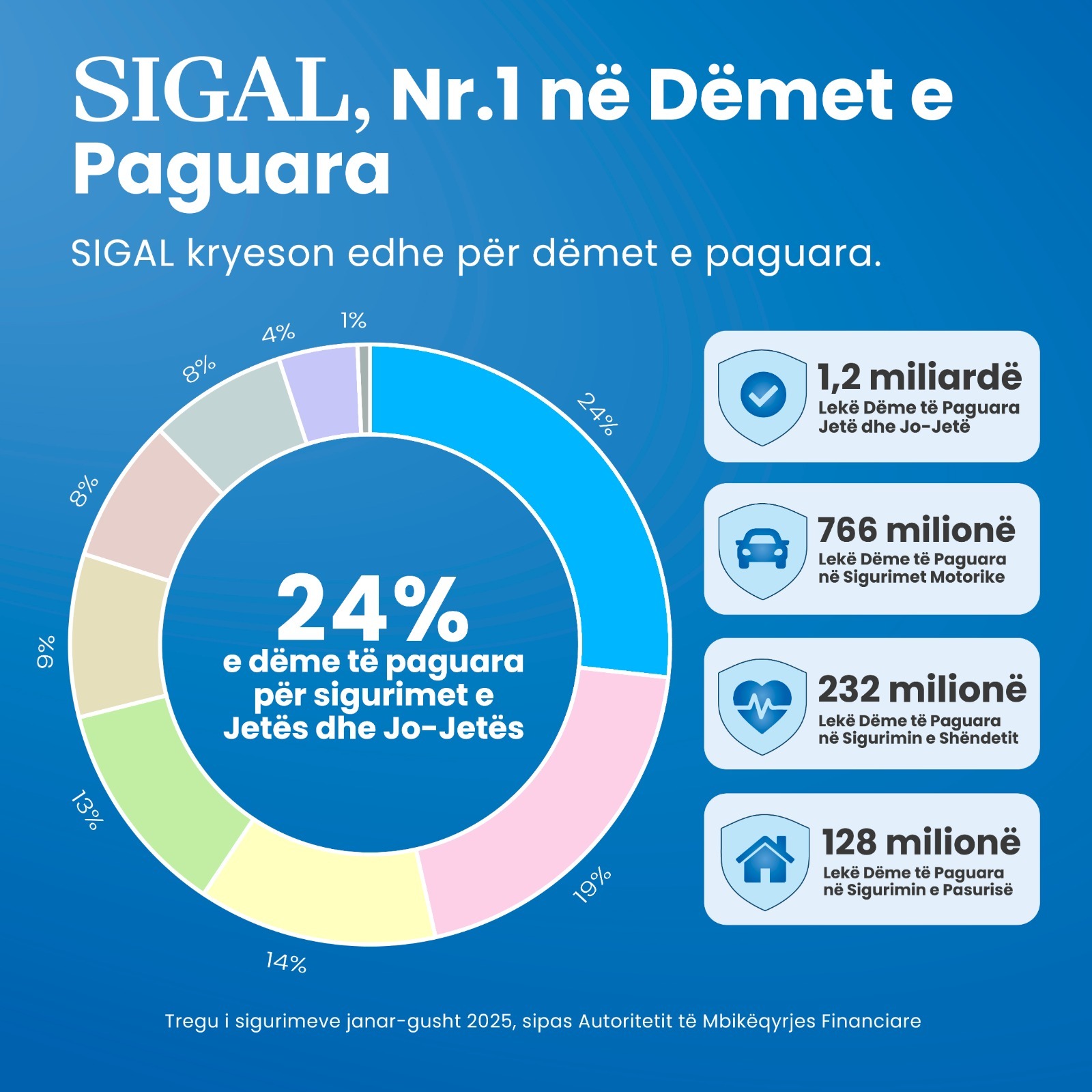 Kjo përfaqëson 23.53% të totalit të dëmeve të paguara në të gjithë tregun e sigurimeve, duke e vendosur SIGAL në krye si kompania që mbulon pothuajse një të katërtën e tregut kombëtar.