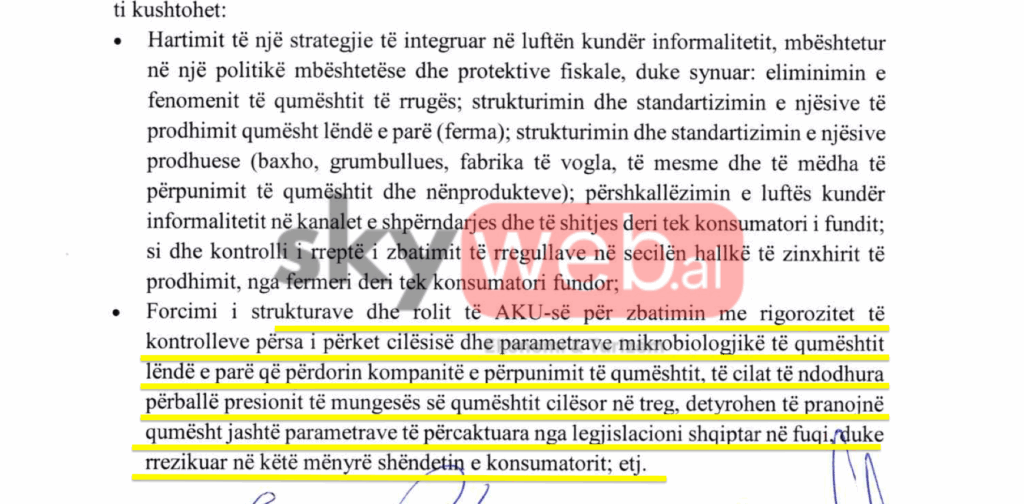 “Forcimi i strukturave dhe rolit të AKU-së për zbatimin me rigorozitet të kontrolleve përsa i përket cilësisë dhe parametrave mikrobiologjikë të qumështit lëndë e parë që përdorin kompanitë e përpunimit të qumështit, të cilat të ndodhura përballë presionit të mungesës së qumështit cilësor në treg, detyrohen të pranojnë qumësht jashtë parametrave të përcaktuar nga legjislacioni shqiptar në fuqi, duke rrezikuar në këtë mënyrë shëndetin e konsumatorit“, citohet në dokumentin e siguruar nga Skyweb.al.