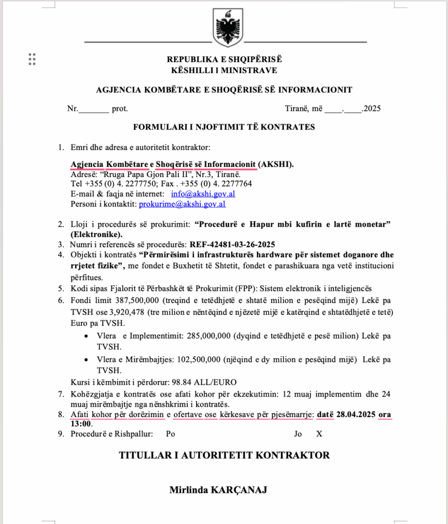 Siç mëson Skyweb.al, në qendër të përplasjes së fundit është tenderi me vlerë 4 milionë euro pa TVSH, me objekt “Përmirësimi i infrastrukturës hardware për sistemet doganore dhe rrjetet fizike”.
