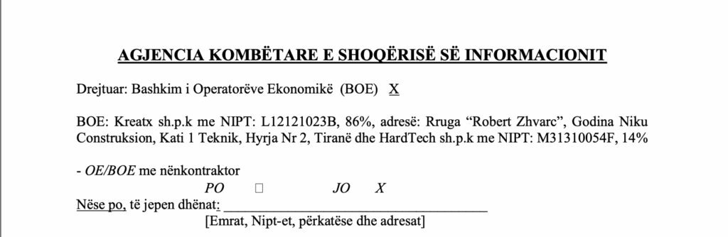 Ndër to, bashkimi i kompanive “Advanced Business Solutions – ABS” e Gerond Meçes, përfituesi kryesor i tenderëve të AKSHI-t dhe “DataLog”, në pronësi të Sokol Sinanit, po ashtu i përfolur për afera me tenderët e AKSHI-t dhe lidhje e ngushtë ish-ministrit të arrestuar Ilir Beqaj, kishte ofruar çmimin më të ulët, rreth 1.6 milionë euro, por u skualifikua për shkaqe teknike, lidhur me mungesën e autorizimit për platformën “Oracle”, mbi të cilën operon sistemi.