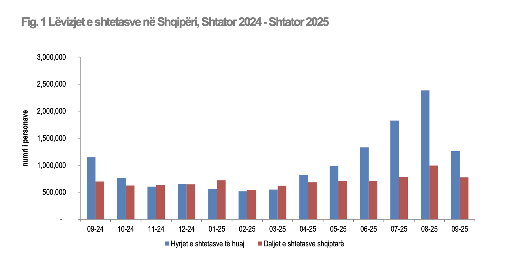 Sipas të dhënave të publikuara nga INSTAT, gjatë shtatorit 2025 kanë hyrë në vend 1.965.601 shtetas shqiptarë dhe të huaj, një rritje prej 9.5% krahasuar me të njëjtën periudhë të vitit të kaluar.