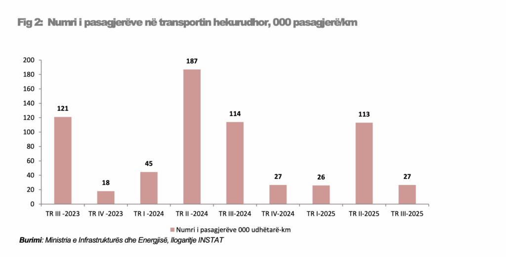 Ndërkohë, transporti i mallrave ka shënuar rritje. Në total, 156,2 mijë ton mallra janë transportuar me hekurudhë në korrik–shtator 2025, duke u rritur me 13,7 % në raport me një vit më parë. Volumi i punës i matur në ton-kilometra arriti në 4 867,5 mijë ton-km, nga 4 546,2 një vit më parë, me një rritje prej 7,1 %.