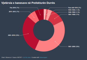 Nga totali prej 66,176 njësi të banuara në Durrës në nivel prefekture grafiku i mëposhtëm na tregon ku banojnë qytetarët e qarkut të grupuar sipas vitit të ndërtimit të banesës.