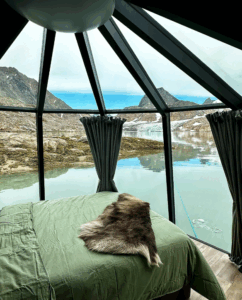 Kjo kabinë gjashtëkëndore, e prodhuar në Finlandë, është një mrekulli e thjeshtë: e izoluar në mënyrë perfekte, me një tavan prej xhami për të parë yjet dhe dritat veriore. Ajo është e ankoruar në një gji përballë Detit të Grenlandës, disa orë me varkë larg qytetit të vogël Tasiilaq. Përreth, asnjë zë njerëzor, vetëm akullnaja, deti dhe ndonjë ndjesi se diku mund të endet ndonjë ari polar.
