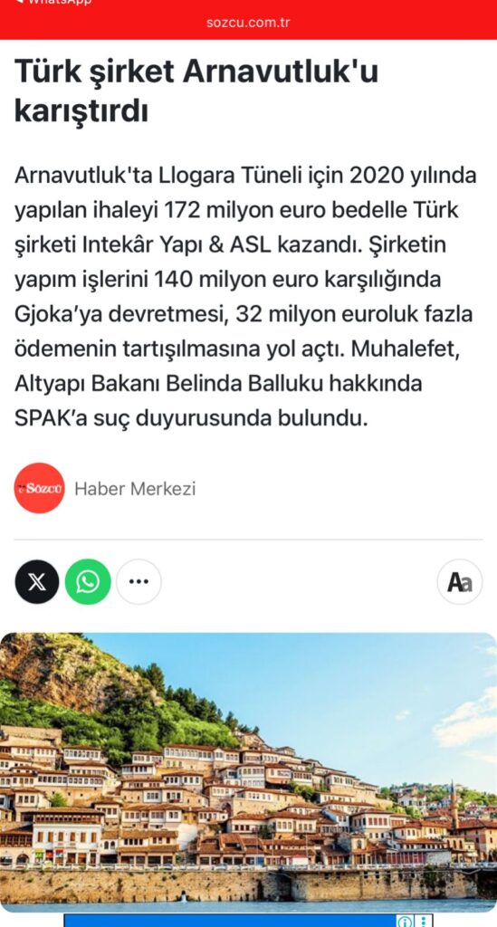 Sipas Sozcu, kompania turke “Intekar Yapi & ASL” fitoi në vitin 2020 tenderin për ndërtimin e tunelit të Llogarasë për 172 milionë euro, por pa kryer asnjë punë vetë, ia kaloi kontratën kompanisë shqiptare “Gjoka Konstruksion” për vetëm 140 milionë euro.