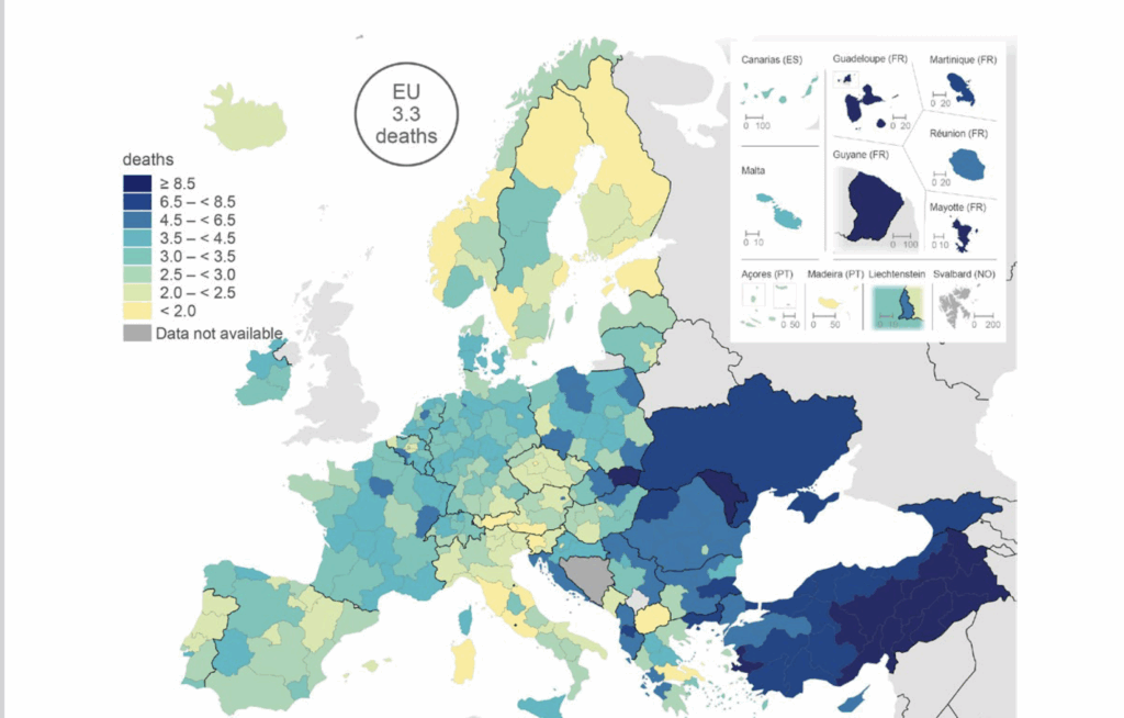 Në kontrast, vendet e BE-së veriore si Finlanda, Suedia, Danimarka dhe Irlanda shfaqin norma ndër më të ulëtat në kontinent, me më pak se 2.5 vdekje për 1 000 lindje, ndërsa Rumania dhe Bullgaria janë ndër vendet me vlera më të larta në Union, me 4.5 deri në 6.5 vdekje.