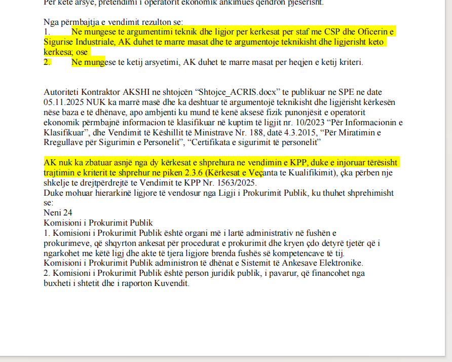 Sipas dokumenteve që ka konsultuar Skyweb.al edhe Komisioni i Prokurimit Publik ka konstatuar se AKSHI nuk ka justifikuar pse tenderi duhet trajtuar si proces që përfshin informacion të klasifikuar, por megjithatë, ndryshimet e kërkuara nga KPP nuk janë reflektuar në dokumentet e rishikuara të tenderit.