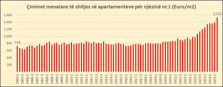 Deri në qershor 2025 në njësinë bashkiake nr.8 çmim mesatar i shitjes së apartamenteve arriti 1,915 euro për metër katror. Krahasuar me 6-mujorin e parë 2005 çmimet janë 1.5 herë më të larta. Për njësinë nr.9 çmim mesatar i shitjes së apartamenteve arriti 1,915 euro për metër katror. Krahasuar me 6-mujorin e parë 2005 çmimet janë 1.5 herë më të larta. Për njësinë nr.9, çmimi mesatar i shitjes në 2025 arriti 1,825 euro për metër katror gati 1,6 herë më të shtrenjta sesa 2005. Këto njësi bashkiake përfshijnë zona si: pranë tregut të Medresë, gjimnazit Partizani, Selvisë, Bulevardi Zogu I etj.