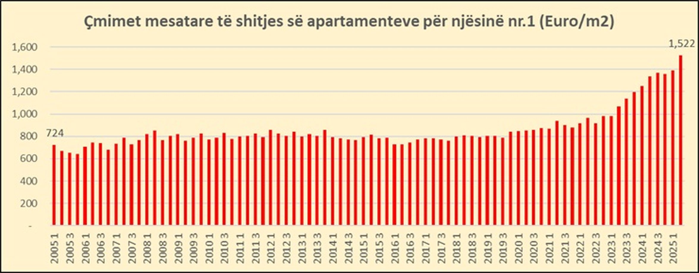 Për zonën e ish Bllokut, indeksi llogarit çmime më vete, ku çmimi mesatar në 2025 ka arritur 2,660 euro për metër katror. Krahasuar me 2005 çmimet gati 3.4 herë më të larta.