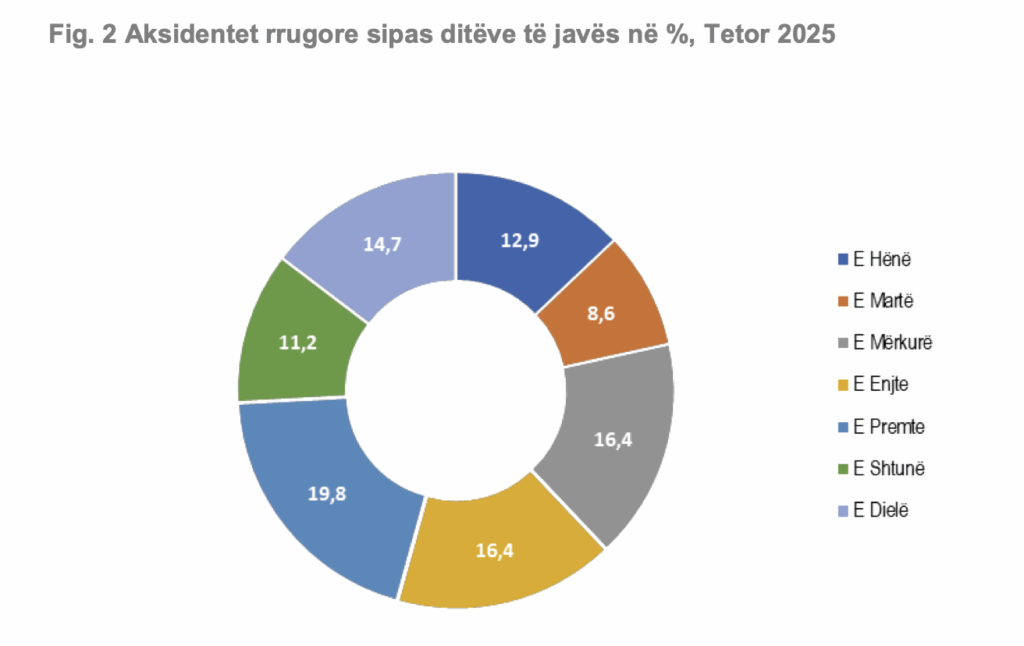 Nga 116 aksidentet e regjistruara gjatë muajit, dita më problematike rezulton e premtja, e cila përqendron 19,8 për qind të ngjarjeve, duke e bërë atë ditën më të rrezikshme për drejtuesit e mjeteve dhe këmbësorët.