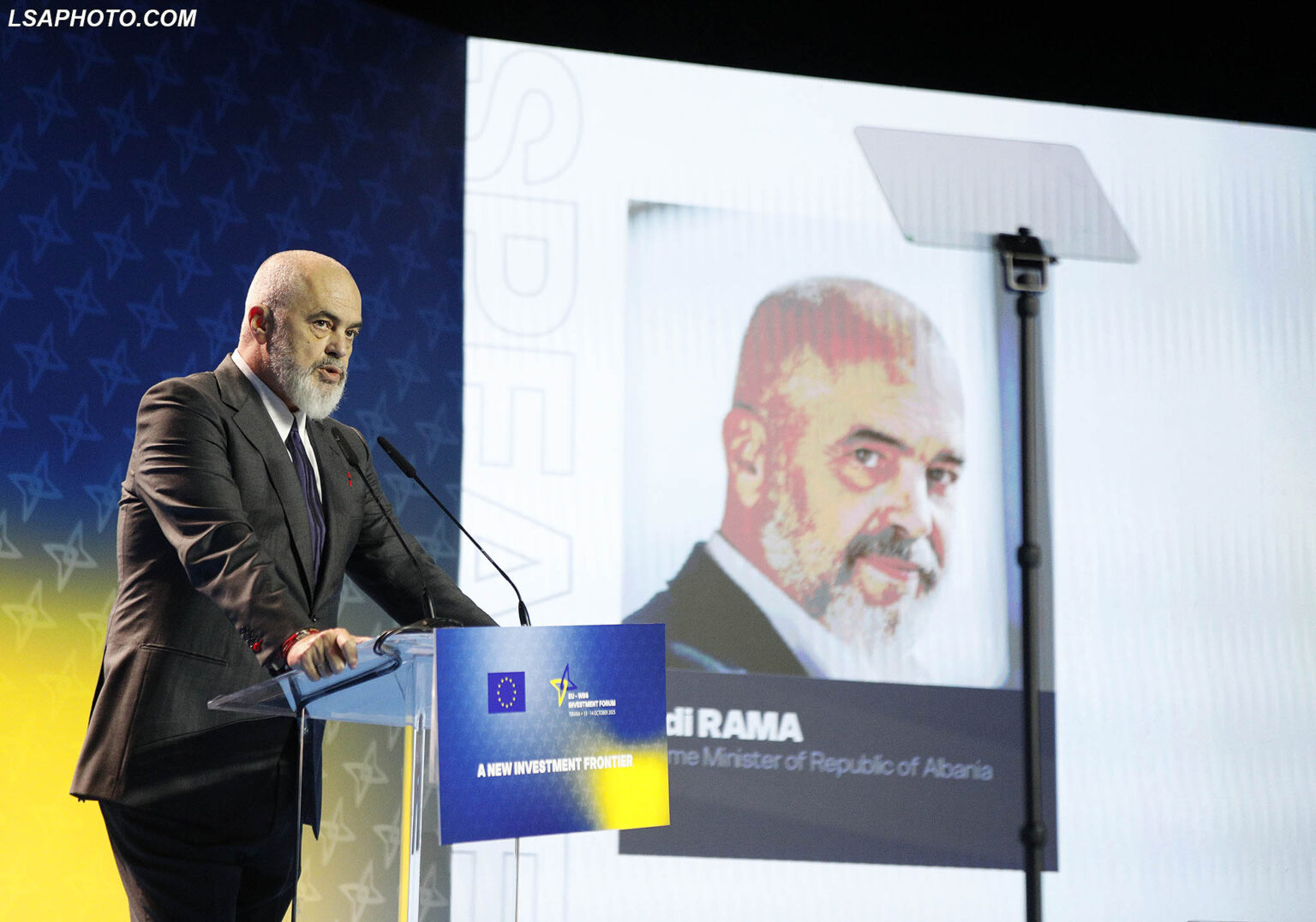 Kryeministri Edi Rama duke folur gjate Forumit te Pare te Investimeve BE – Ballkani Perendimor, i mbajtur ne ambientet e pallatit te kongreseve. Gjate forumit u fol rreth rrugetimin te Shqiperise drejt BE dhe investimeve ne Shqiperi./r/n/r/nPrime Minister Edi Rama speaking during the First EU-Western Balkans Investment Forum, held at the Congress Palace. During the forum, Albania's journey towards the EU and investments in Albania were discussed.