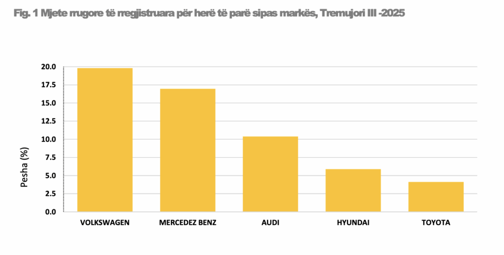 Por dinamika më e dukshme e këtij tremujori është ajo e fronit të markave. Tek mjetet e regjistruara rishtazi, Volkswagen ka kaluar në vend të parë me 19.8%, duke lënë pas Mercedes-Benz, që zbriti në 17%. /skyweb.al