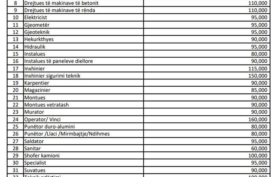 Lista e pagave indikative nis me sanitarët, me 600 mijë lekë të vjetra në muaj, ndërsa më pas renditen bojaxhinjtë dhe pllakaxhinjtë me 850 mijë dhe 900 mijë lekë. Pagat më të larta në sektor i takojnë arkitektëve dhe menaxherëve.