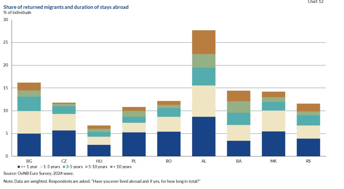 Anketa e Bankës Qendrore të Austrisë në fund të vitit 2024 vuri në dukje se gjysma e atyre që ishin rikthyer në Shqipëri donin të largoheshin sërish. 30 për qind e tyre që morën pjesë në anketë kishin jetuar jashtë vendit më parë, por gjysma e tyre rreth 50% duan të largohen sërish, pasi po përjetojnë zhgënjim.