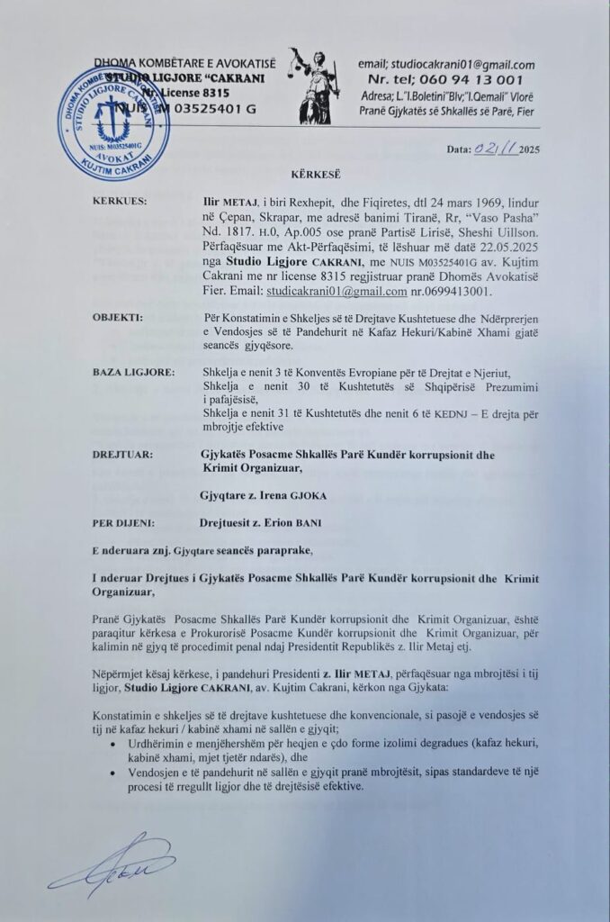 Në dokumentin e depozituar, mbrojtja kërkon konstatimin e shkeljes së të drejtave kushtetuese dhe heqjen e barrierave fizike, duke kërkuar që Meta të vendoset pranë avokatit të tij gjatë të gjithë procesit gjyqësor.