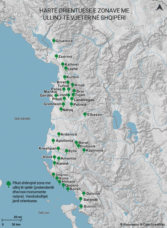 Hartë orientuese e zonave me ullinj të vjetër në Shqipëri. Pikat shënojnë zonat me ullinj të vjetër pretendentë dhe/ose monumente natyre. Vendndodhjet janë të përafërta.