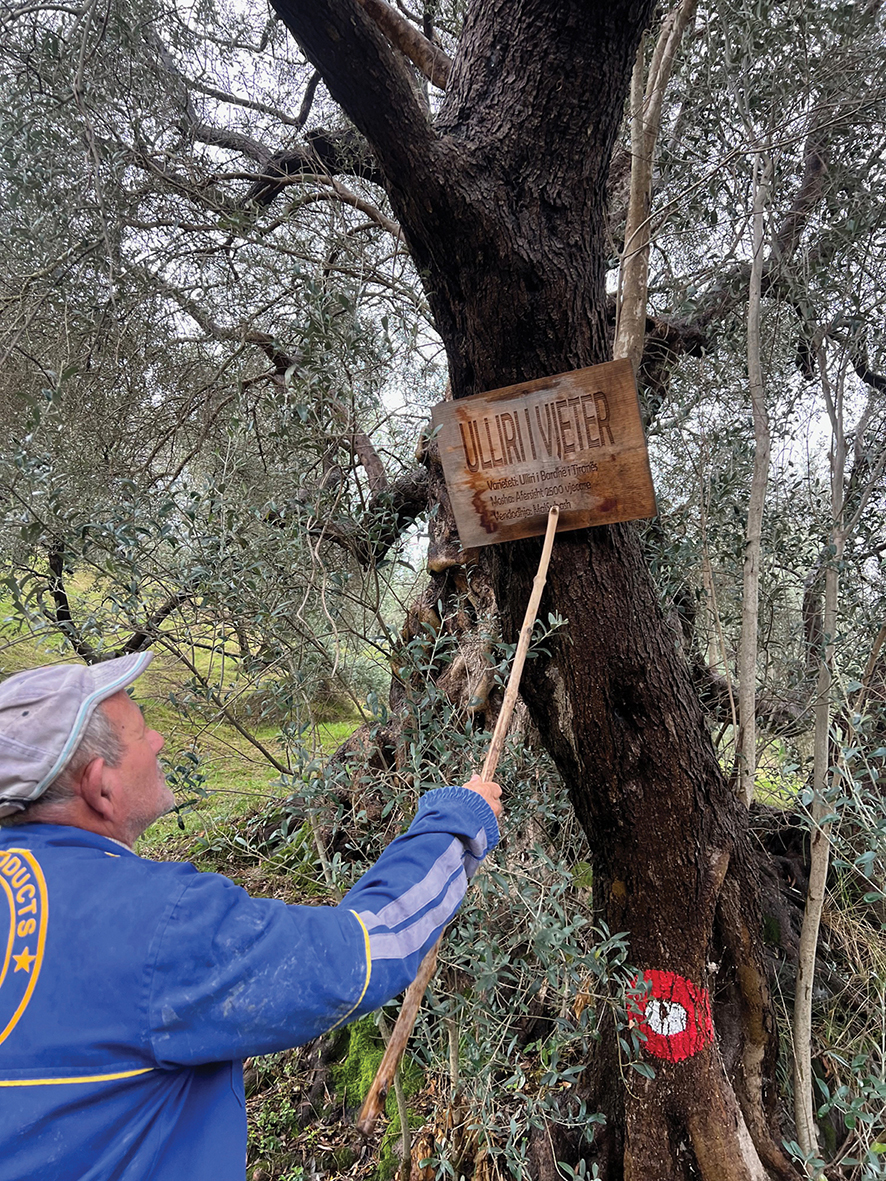 Në ullishtat e Marikajt takojmë Mehdiun, banor i zonës, që na tregon ullirin e moçëm ~2 500-vjeçar. Foto: Autori.