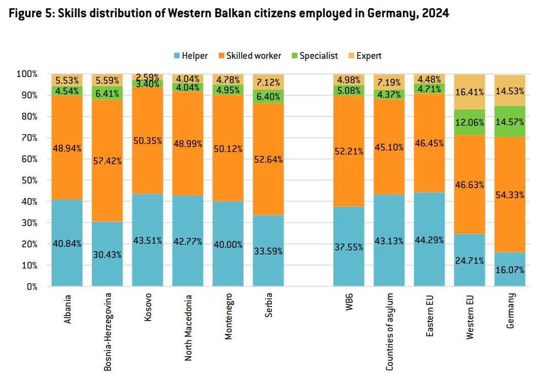 Sipas raportit, 40.84% e shqiptarëve në Gjermani punojnë si “helper” (ndihmës), një kategori që përfshin punë të pakualifikuara ose gjysmë-kualifikuara, si punë fizike, logjistikë, shërbime dhe industri bazë. Ky është ndër nivelet më të larta në rajon, krahasuar me Bosnjën (30.43%) dhe Serbinë (33.59%).