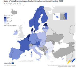 Të dhënat e Eurostat për vitin 2024 tregojnë se 14.2% e personave të moshës 15-34 vjeç në Bashkimin Evropian kanë braktisur arsimin ose trajnimin formal të paktën një herë në jetën e tyre.