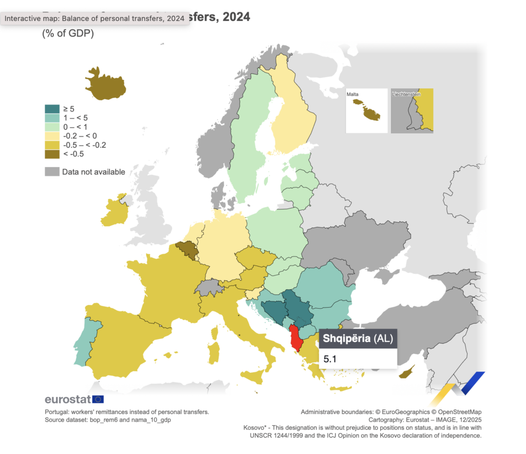 Sipas Eurostat, transfertat dhe kompensimi i punonjësve përfaqësojnë 5.1 për qind të PBB-së, duke e renditur vendin të tretin në kontinent pas Bosnjë-Hercegovinës me 7.6 për qind dhe Serbisë me 5.4 për qind.