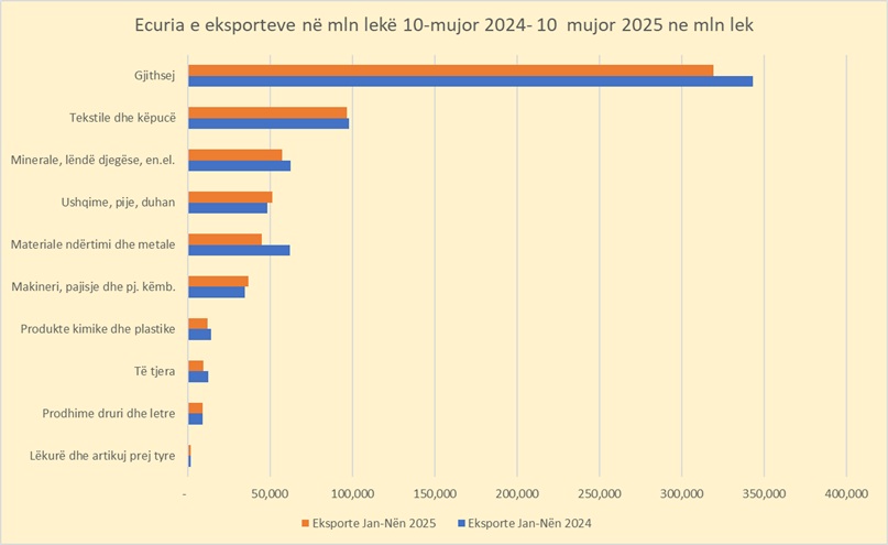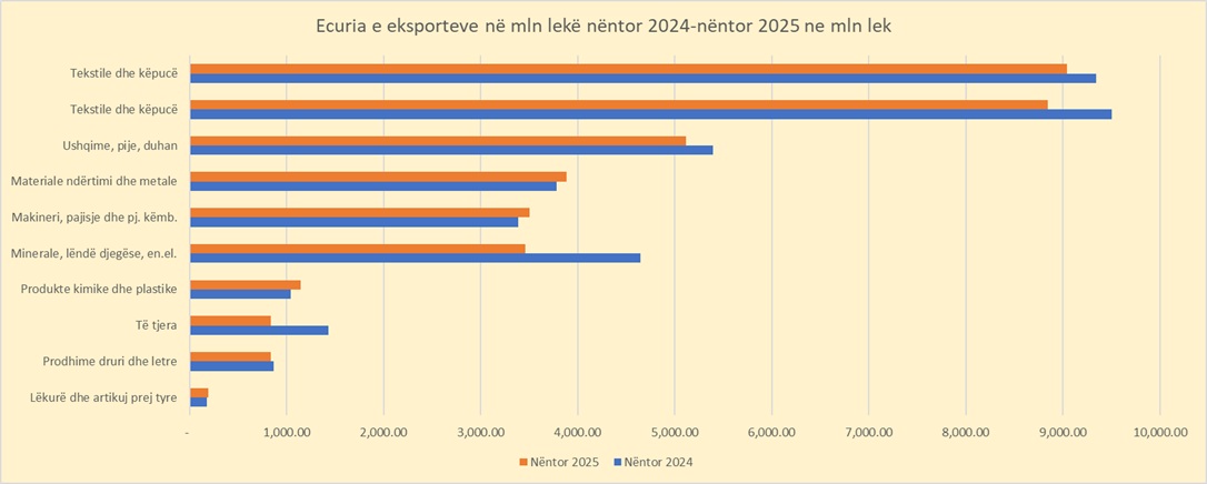 Sipas të dhënave të rishikuara të INSTAT, ndikimin në tendencën rënëse si në shtator dhe për 11 mujorin e ka dhënë grupi materiale ndërtimi e metale, si rrjedhojë e mbylljes së aktivitetit të Kurum dhe më pak minerale, lëndë djegëse e energji. Eksportet e tekstileve e këpucë u rikuperuan në shtator dhe për 11 mujorin janë me një rënie -1.2%.