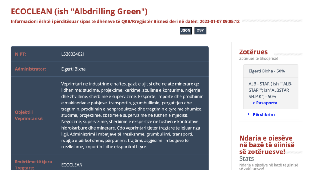 Në fokus është edhe Elgerti Bixha, një emër me lidhje të shumta në biznesin e ndërtimit dhe sektorin e naftës në Patos. Sipas verifikimeve të Skyweb.al, ai është ortak me 50% në kompaninë ECOCLEAN me Idajet Ismailajn dhe në Fortis Beto CO me biznesmenin Orest Sota.