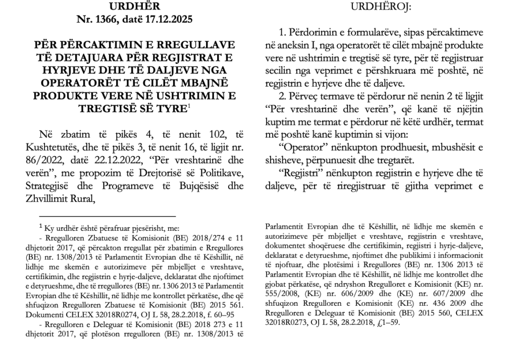 Sipas urdhrit, çdo operator që prodhon, përpunon apo tregton verë do të jetë i detyruar të regjistrojë me detaje çdo sasi, çdo veprim dhe çdo humbje, përfshirë edhe avullimin gjatë magazinimit.