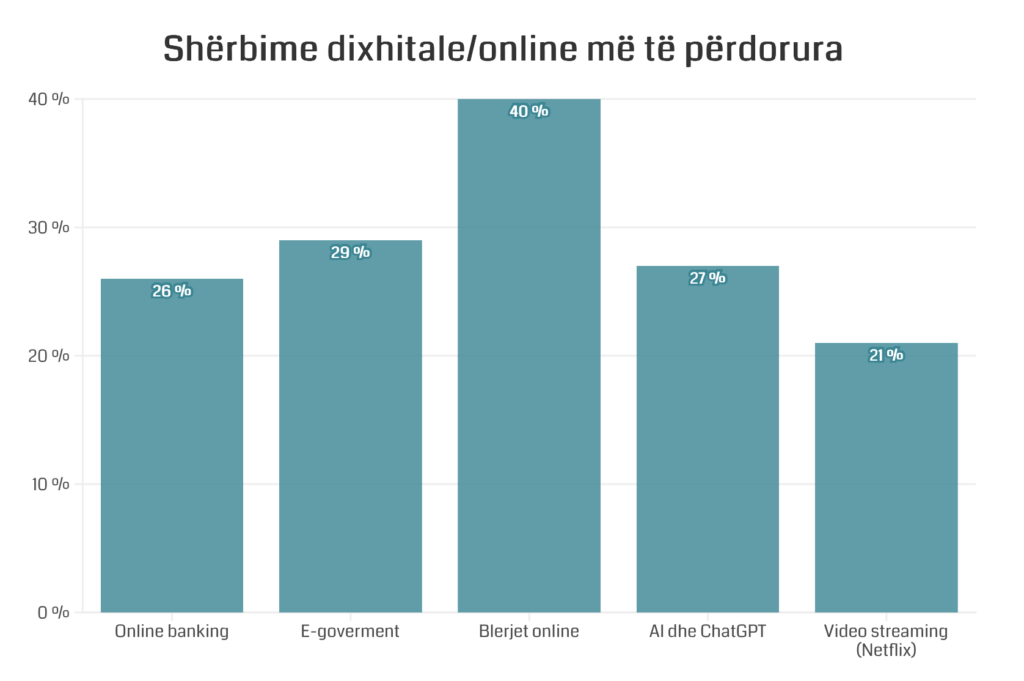 Nga ana tjetër, një shërbim mjaft i përhapur është online banking, i cili përdoret nga 26% e shqiptarëve, duke shënuar nivelin më të ulët të përdorimit në Ballkanin Perëndimor. Megjithatë, panorama ndryshon në sektorë të tjerë. Sa i përket shërbimeve të e-government, Shqipëria renditet e para në rajon për nivelin e përdorimit, me 29% të qytetarëve që i përdorin këto shërbime. Ky nivel i lartë lidhet kryesisht me domosdoshmërinë e aksesit në shërbimet publike online.