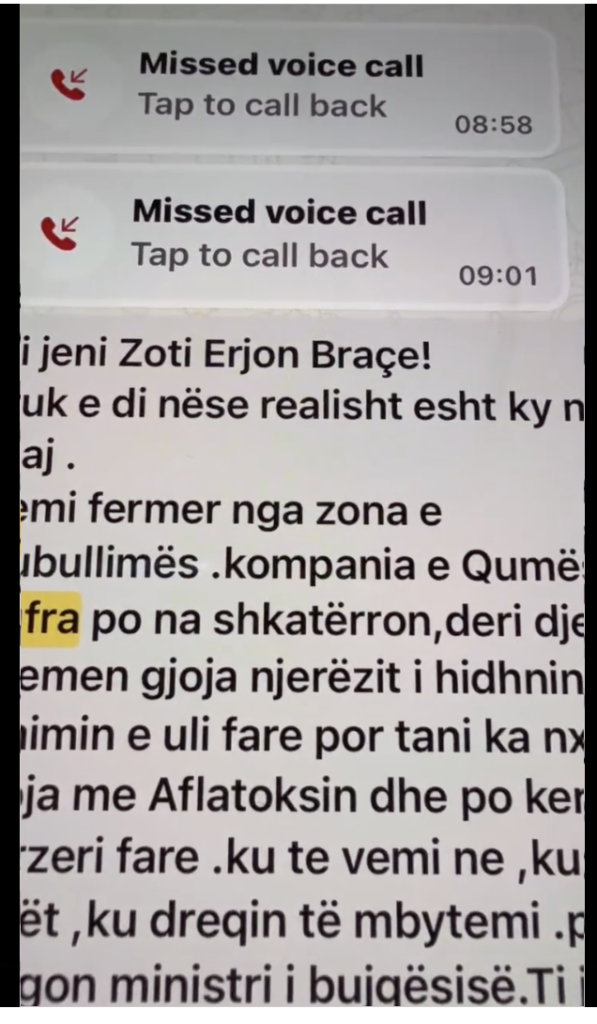 Siç konstatohet edhe nga SMS-ja e fermerit, shpërndarë nga deputeti Erion Braçe, përpunuesi i qumështit refuzon grumbullimin e qumështit që rezulton me aflatoksinë, pas analizave të kryera në momentin e dorëzimit, dhe nuk e fut atë në zinxhirin e prodhimit.