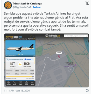 Një alarm sigurie u aktivizua të enjten në mëngjes (15 janar) në aeroportin El Prat të Barcelonës, pasi një avion i Turkish Airlines u detyrua të kryente një ulje emergjente për shkak të një kërcënimi për bombë. Bëhet fjalë për një Airbus A321 që po operonte fluturimin TK1853 nga Stambolli drejt Barcelonës, me mbërritje të planifikuar rreth orës 11:00.