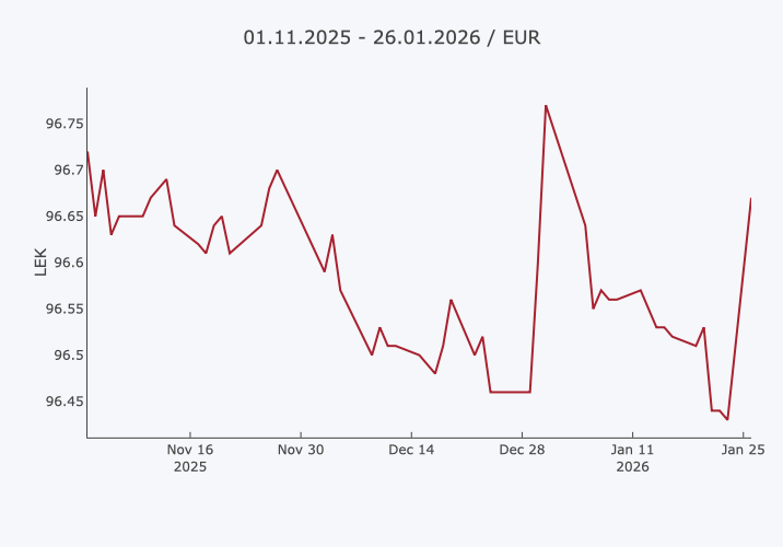 Sipas kursit zyrtar të këmbimit të publikuar nga Banka e Shqipërisë, një euro u këmbye sot mesatarisht me 96.67 lekë, ndërsa në mbyllje të javës së kaluar ishte 96.43 lekë, duke shënuar një rritje prej rreth 0.2 pikësh.