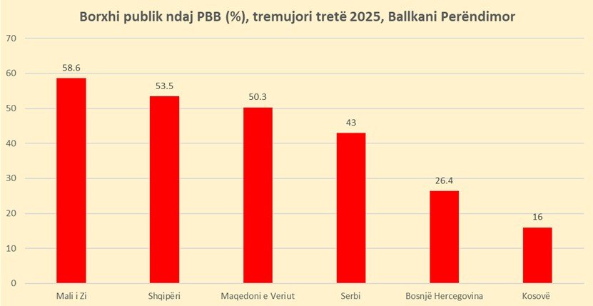Në të dhënat e tremujorit të tretë të vitit 2025, borxhi publik i Shqipërisë arriti në 53.5% të PBB-së, duke e renditur vendin si të dytin në Ballkanin Perëndimor, vetëm pas Malit të Zi, ku ky tregues shënon 58.6% të PBB-së.