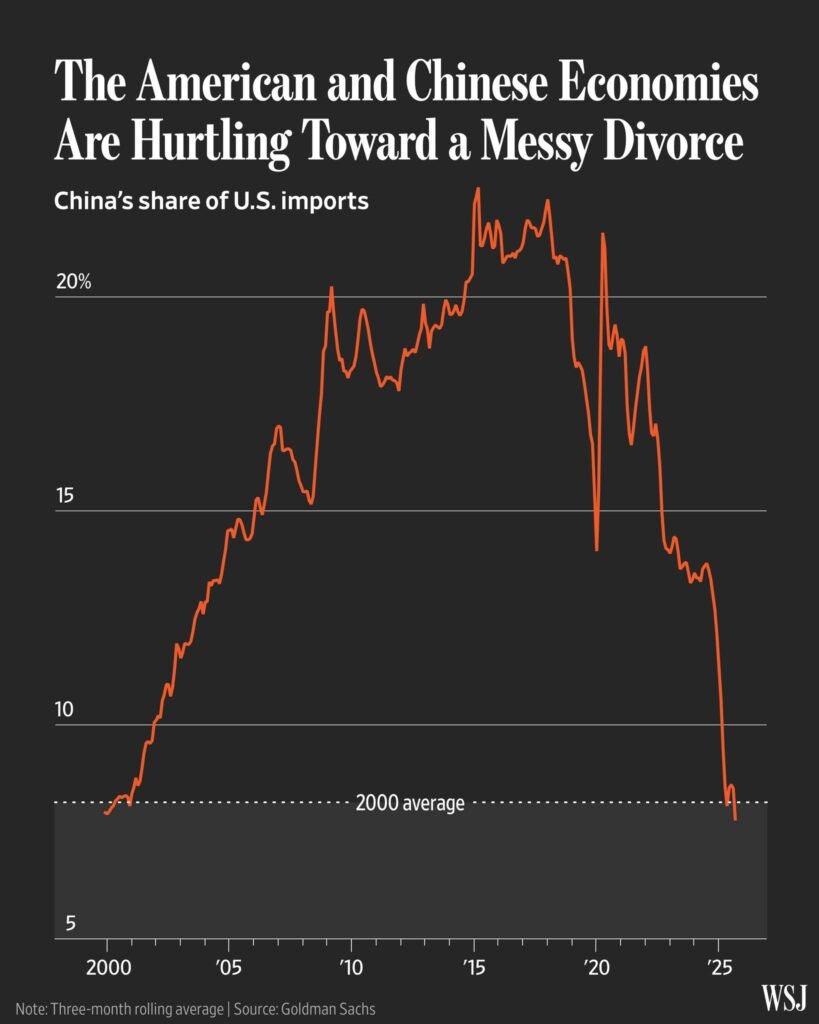 Të dhënat tregojnë një rënie të fortë të pranisë kineze në importet amerikane. Deri në fund të vitit 2025, pjesa e Kinës në importet e SHBA ka zbritur në rreth 7.5 për qind, duke fshirë mbi dy dekada rritje të pandërprerë që nisën pas anëtarësimit të Kinës në Organizatën Botërore të Tregtisë në vitin 2001.