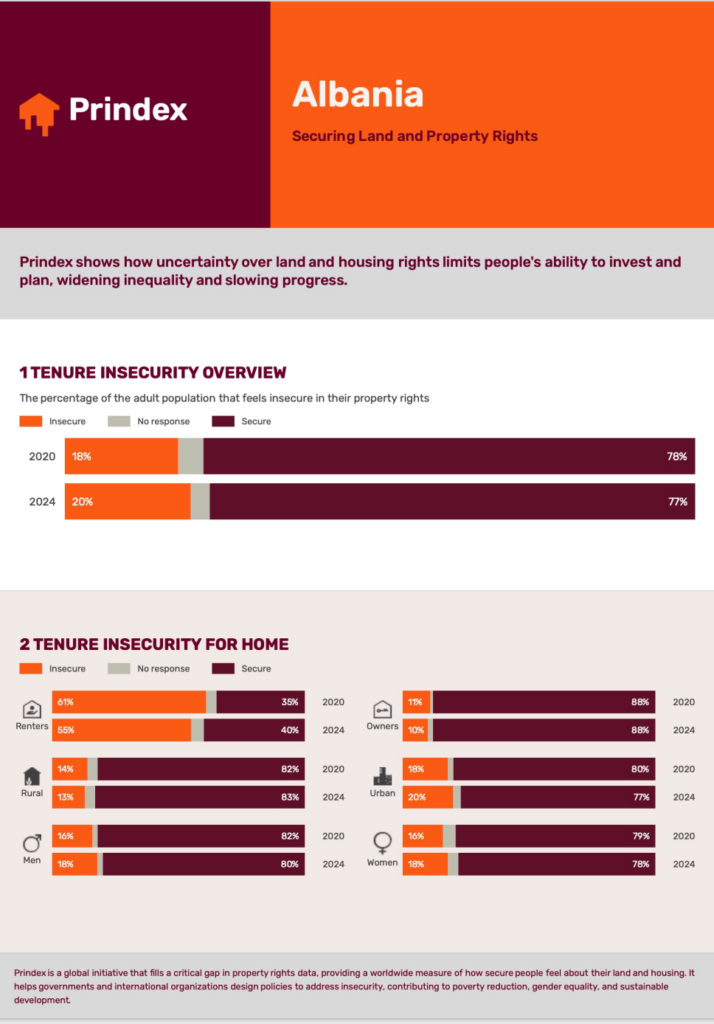 Të dhënat më të fundit tregojnë se rreth një në pesë shqiptarë, ose afërsisht 20 për qind e popullsisë, ndihen të pasigurt për të drejtat e tyre mbi pronën, një nivel ndër më të lartët në Europë. Ky tregues ka shënuar rritje krahasuar me vitin 2020, kur niveli i pasigurisë ishte rreth 18 për qind, duke sinjalizuar një prirje negative pavarësisht reformave të ndërmarra.