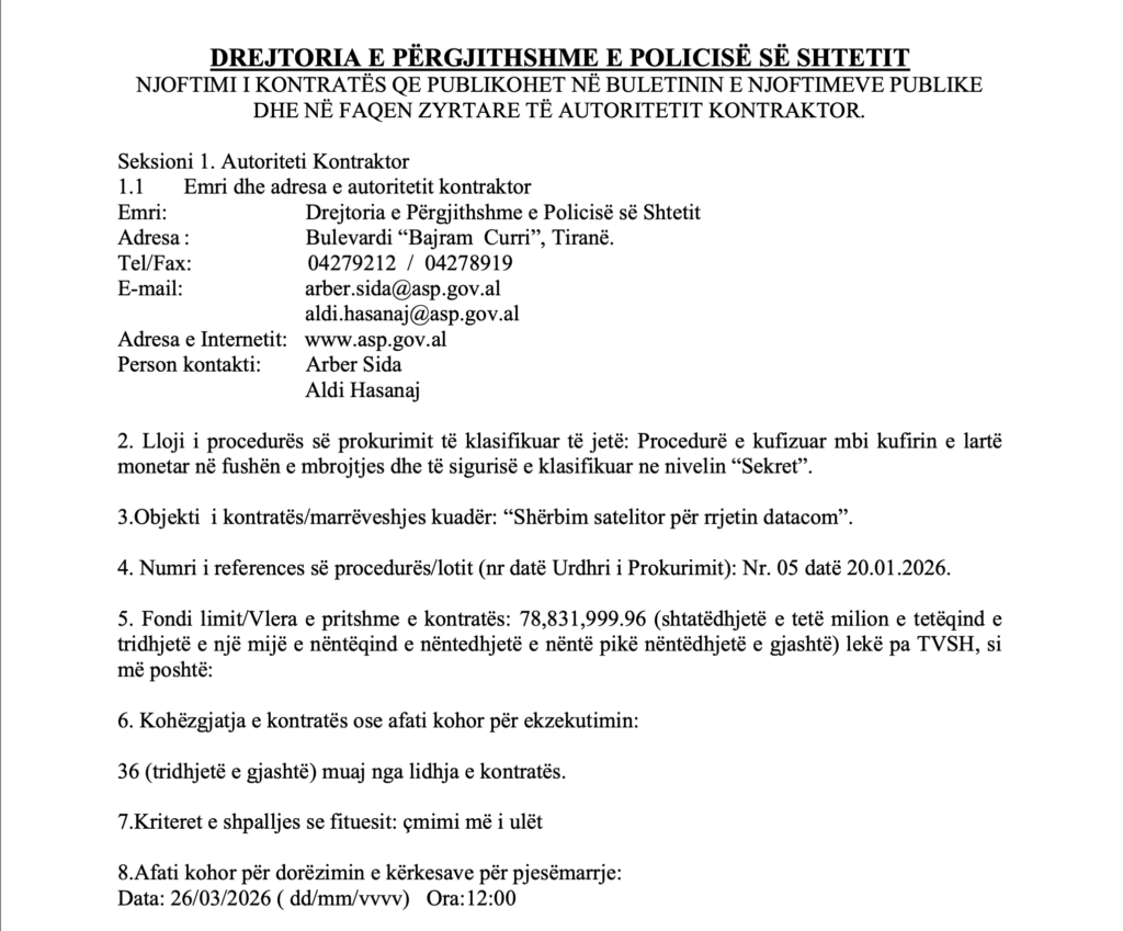 Procedura e prokurimit është shpallur si tender me klasifikim “Sekret” dhe, sipas dokumentacionit, do të zhvillohet në një formë të ndryshme nga procedurat klasike të prokurimit publik.