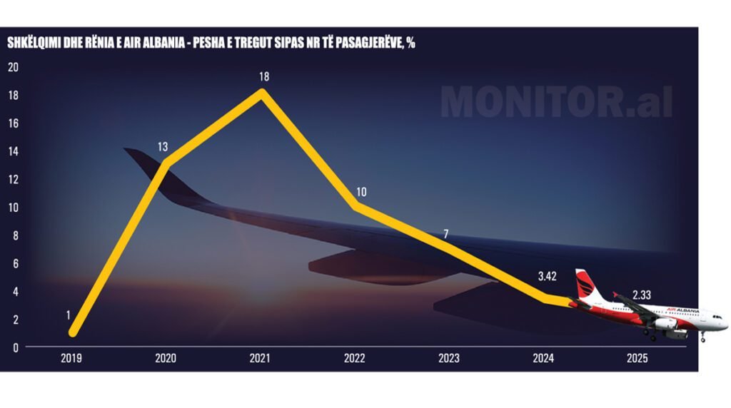 Kjo e fundit nisi të anulonte vazhdimisht fluturimet, derisa i ndaloi ato në dhjetor. Vitin 2025, “Air Albania” e mbylli me një pjesë tregu prej vetëm 2.33%, duke zbritur në operatorin e pestë më të madh në vend.