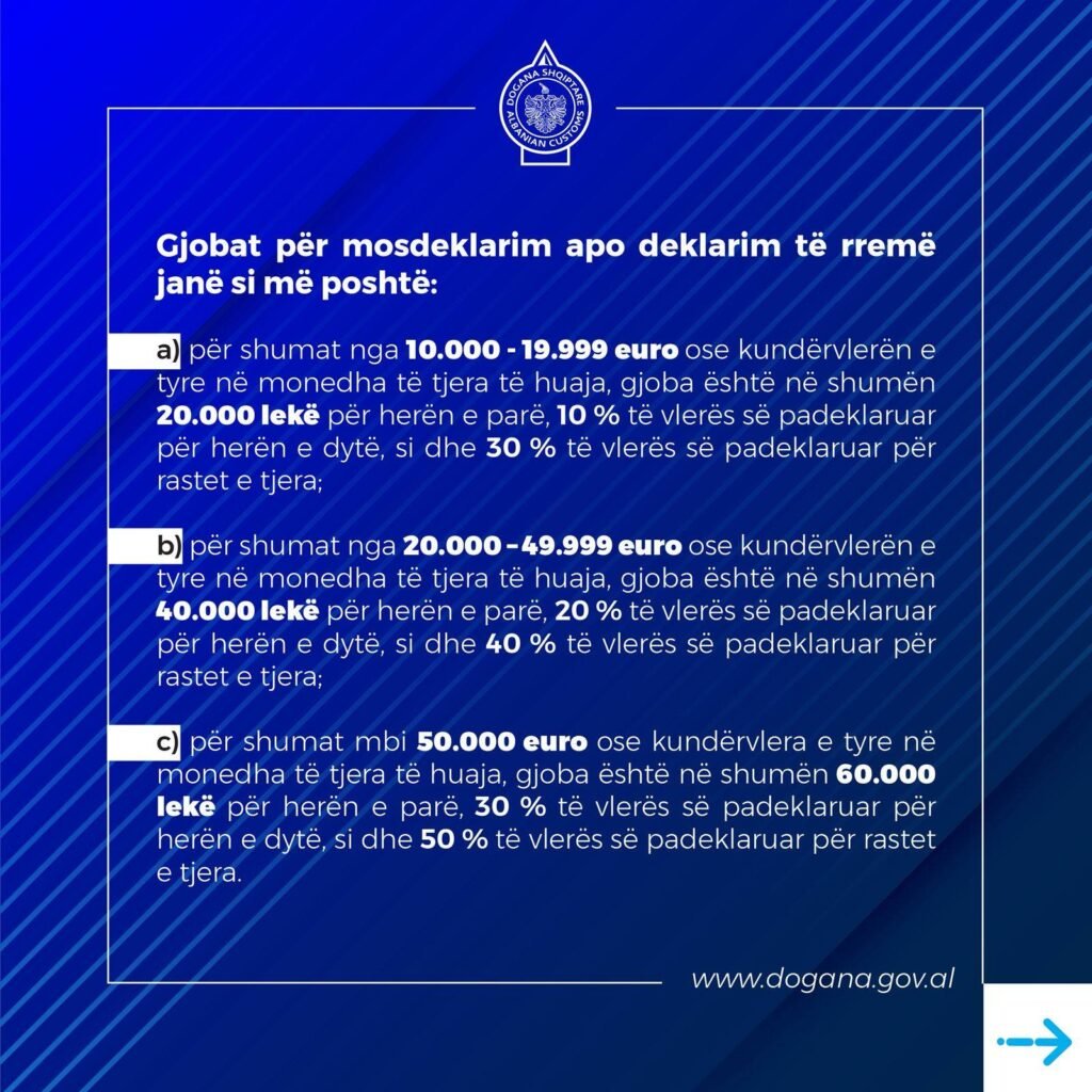Administrata Doganore ka përcaktuar nivelet e gjobave për rastet e mosdeklarimit ose deklarimit të rremë të shumave monetare në pikat e kalimit kufitar, të cilat ndryshojnë në varësi të vlerës së padeklaruar.