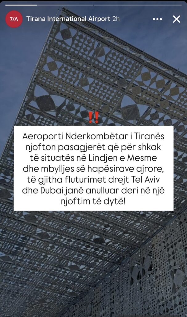 Fluturimet nga Aeroporti Ndërkombëtar i Tiranës drejt Tel Avivit dhe Dubait janë pezulluar deri në një njoftim të dytë, për shkak të situatës së sigurisë në Lindjen e Mesme dhe mbylljes së hapësirave ajrore në disa zona të rajonit.