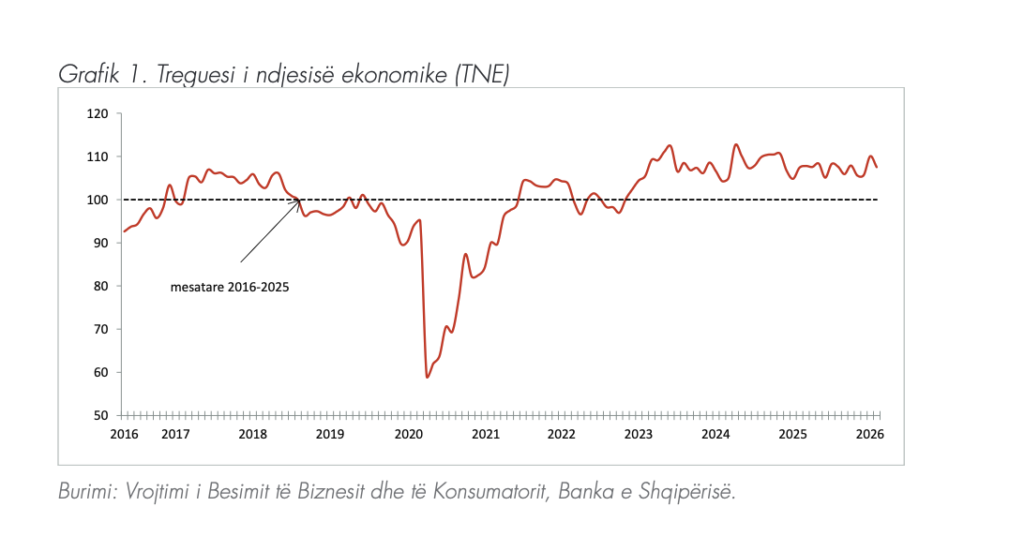 Megjithëse niveli i treguesit mbetet ende rreth 12 pikë përqindje mbi mesataren afatgjatë, dinamika e rënies tregon një përkeqësim të perceptimit të bizneseve për situatën aktuale dhe porositë në vazhdim.