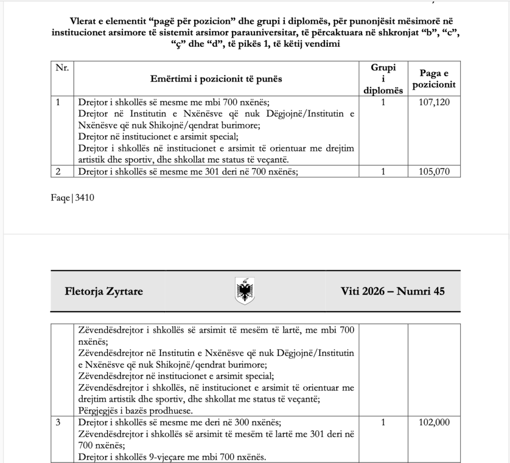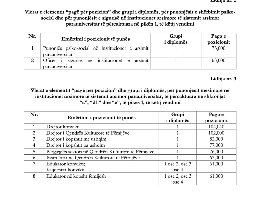Qeveria ka miratuar ndryshime në vendimin për strukturën dhe nivelet e pagave të punonjësve mësimorë dhe jomësimorë në sistemin arsimor parauniversitar, duke përditësuar tabelat përkatëse dhe elementët e pagës së pozicionit. Vendimi i ri sjell një rishikim të plotë të skemës së pagave.