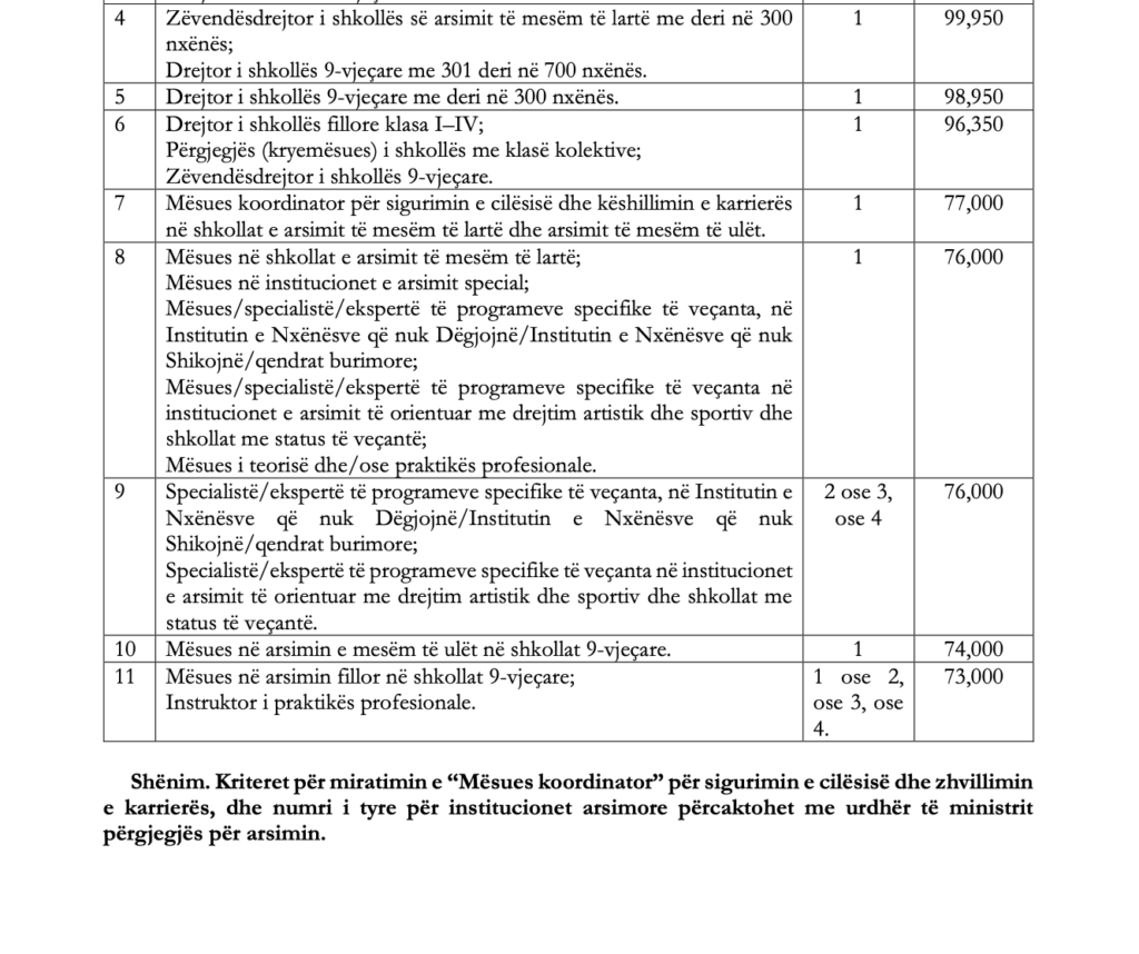 Sipas vendimit, një pjesë e pozicioneve përfitojnë jo vetëm indeksimin me 2.5%, por edhe rritje shtesë në kuadër të politikës së pagave, ndërsa për pozicionet e tjera aplikohet vetëm indeksimi në të njëjtën masë. Ndryshimet prekin kategori të ndryshme të stafit në institucionet arsimore dhe në institucionet plotësuese të sistemit parauniversitar.