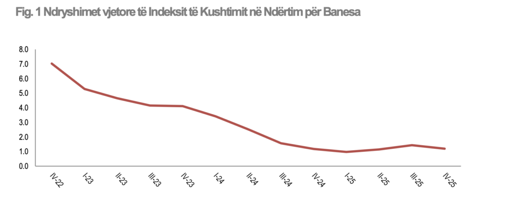 Sipas të dhënave të Indeksit të Kushtimit në Ndërtim, në tremujorin e katërt të vitit 2025 indeksi arriti në 114,1 pikë, duke marrë si periudhë bazë tremujorin e katërt të vitit 2021.