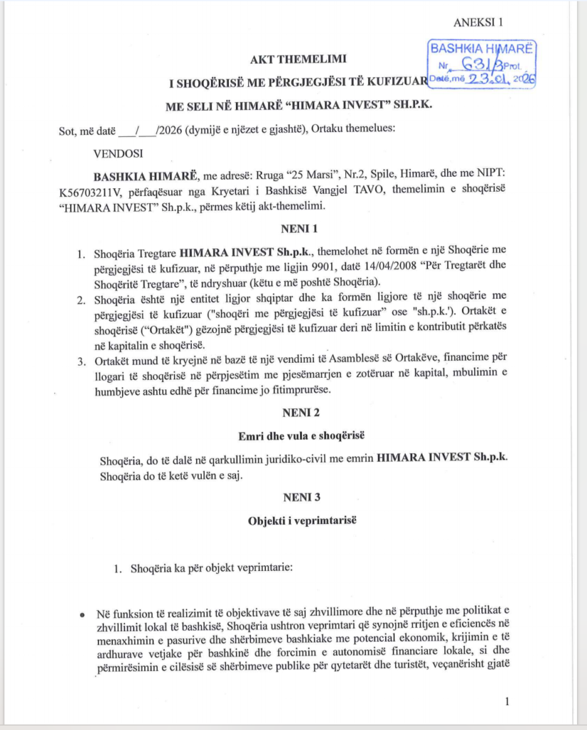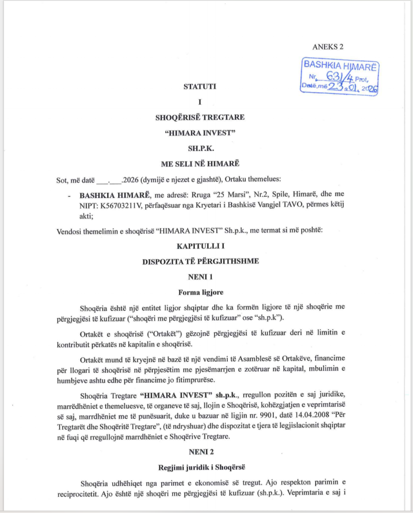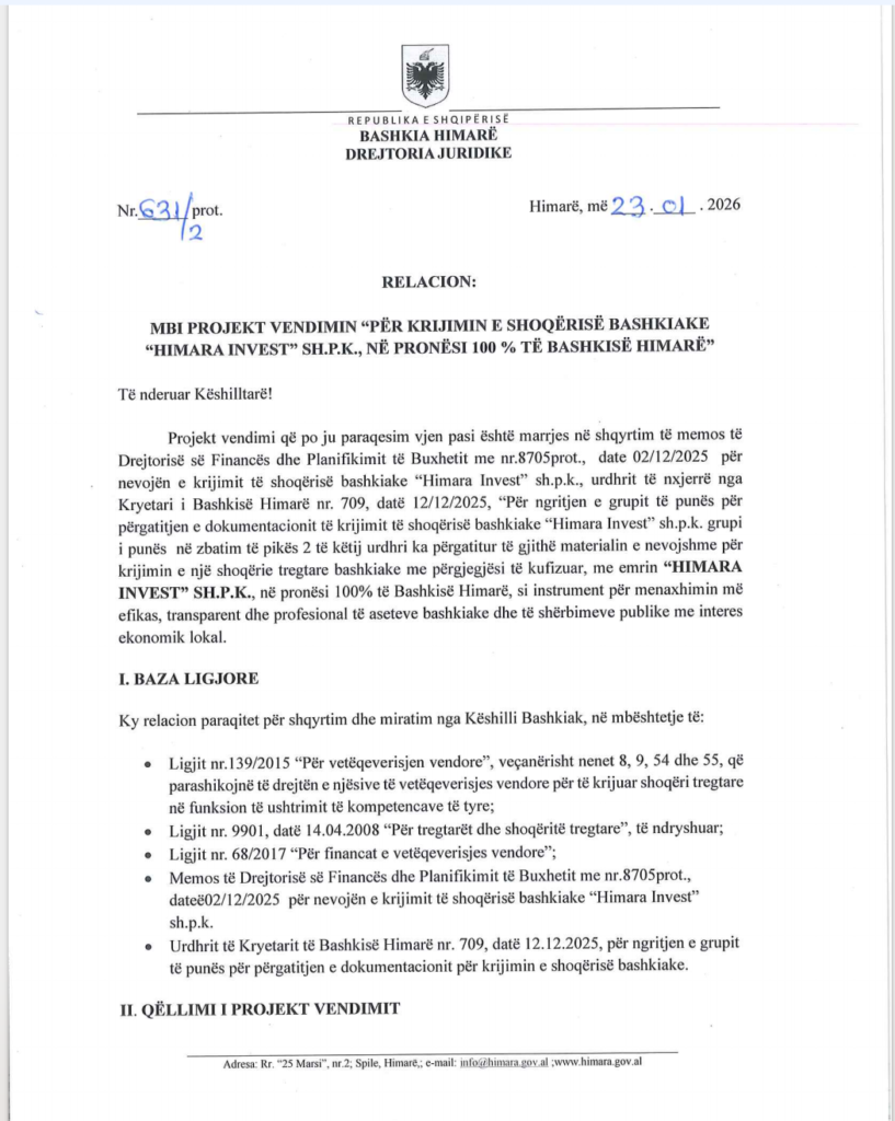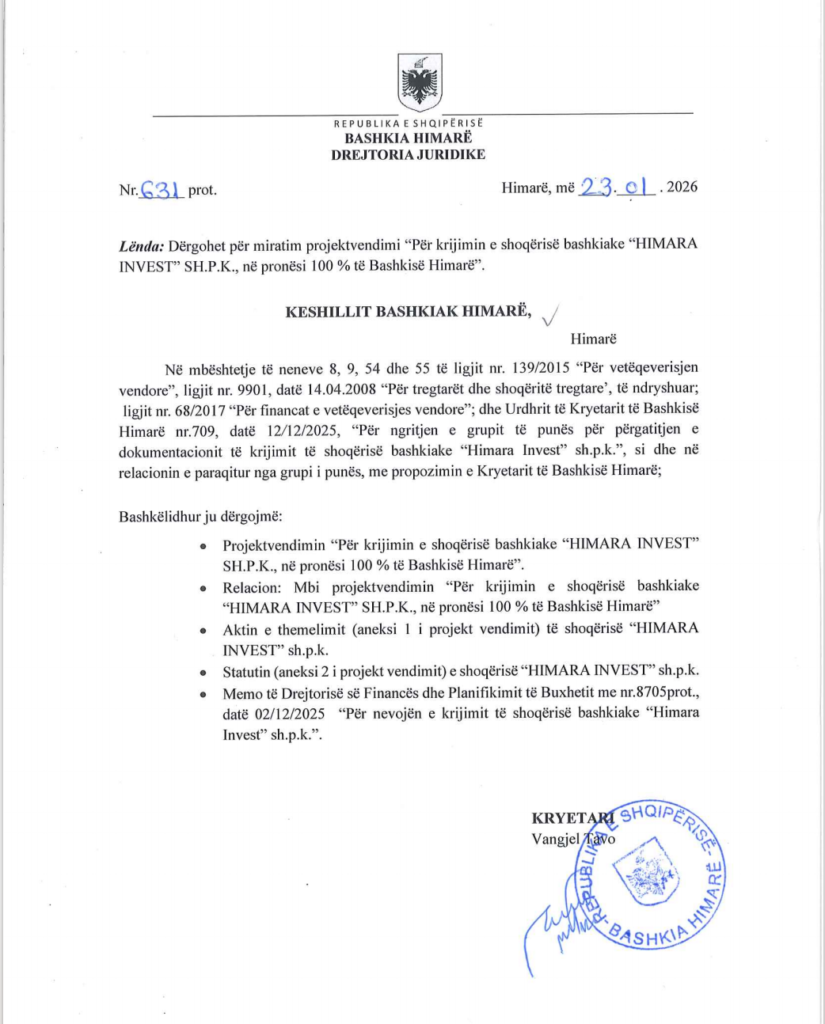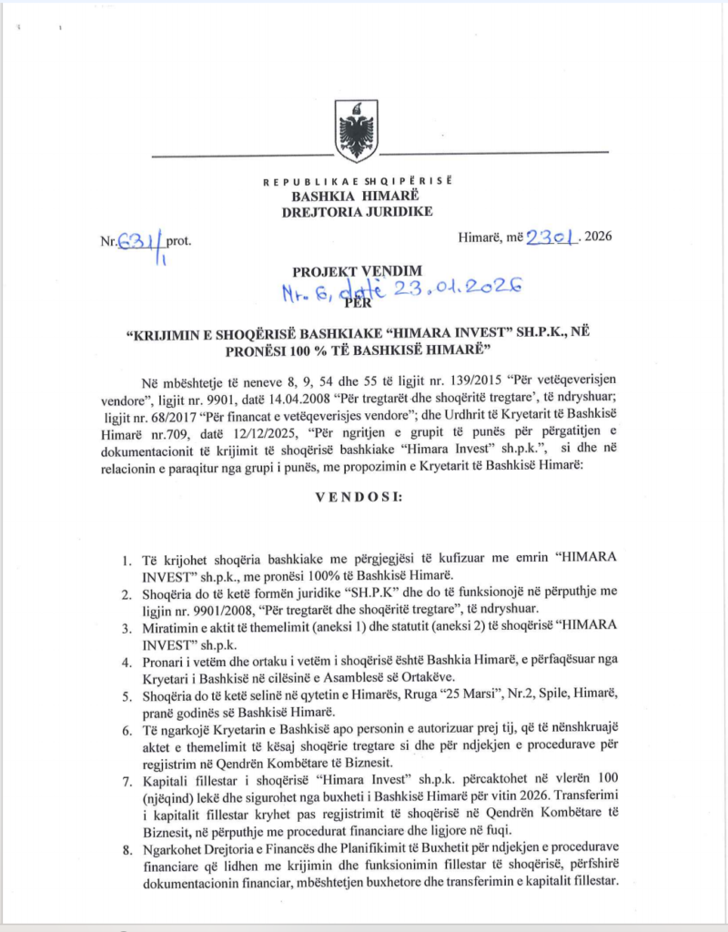 Në fund të janarit 2026, Këshilli Bashkiak i Himarës miratoi krijimin e shoqërisë “Himara Invest” sh.p.k. Sipas dokumentacionit të siguruar nga Skyweb.al, kjo shoqëri parashikohet të funksionojë si një entitet i pavarur që do të administrojë, në praktikë si një subjekt privat, pronat e Bashkisë Himarë.