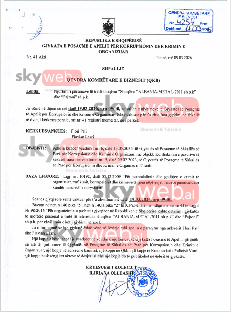 Sipas dokumenteve të siguruara nga Skyweb.al, seanca në Gjykatën e Apelit të GJKKO për këtë çështje është caktuar të zhvillohet më 19 mars në orën 09:00 në ambientet e kësaj gjykate./skyweb.al