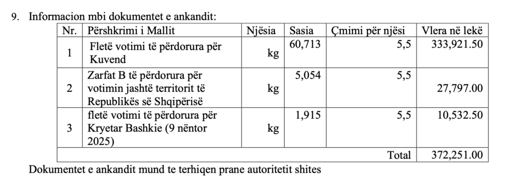 Siç mëson skyweb.al, pjesën më të madhe e zënë fletët e votimit për Kuvendin me mbi 60 mijë kilogramë, ndërsa pjesë e shitjes janë edhe mbi 5 mijë kilogramë zarfa të përdorur për votimin nga jashtë vendit, si dhe materiale të tjera zgjedhore nga procese të mëparshme.