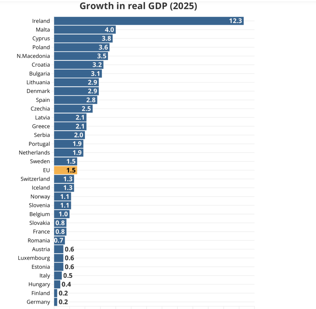 Ekonomia europiane ka shfaqur një përmirësim të lehtë gjatë vitit 2025, por diferencat mes vendeve mbeten të theksuara, me Spanjën që udhëheq mes ekonomive të mëdha dhe Gjermaninë që mbetet në fund të renditjes.