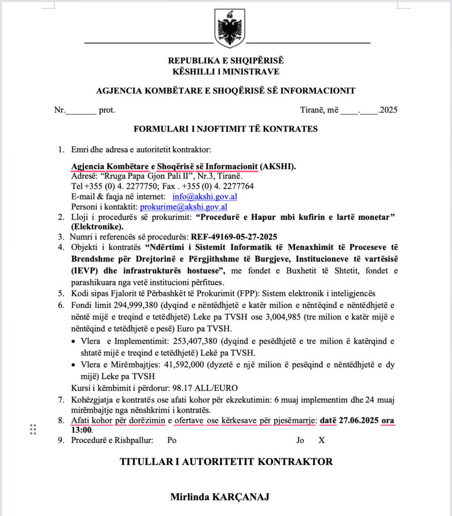 Në dokumentin për këtë procedurë figuron edhe firma e drejtorit të ri të AKSHI-t, i cili duket se po vijon të njëjtën linjë të mëparshme, pa ndryshime në mënyrën e menaxhimit të tenderëve.