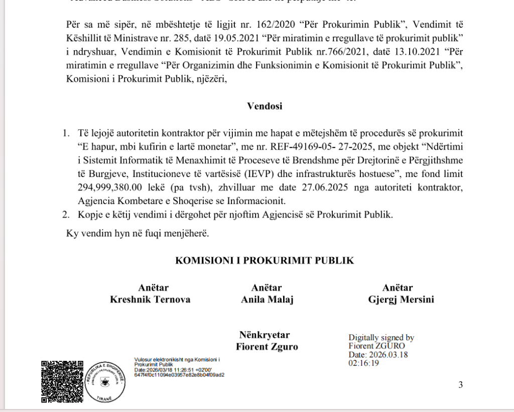 Në vendimin e datës 12 janar 2026, KPP pranoi pjesërisht ankesën e ABS dhe urdhëroi AKSHI-n të bëjë rivlerësim të procedurës, duke kualifikuar këtë kompani sipas konstatimeve të bëra, ndërsa dje ka urdhëruar vijimin e procedurave për shpalljen e fituesit të këtij tenderi.