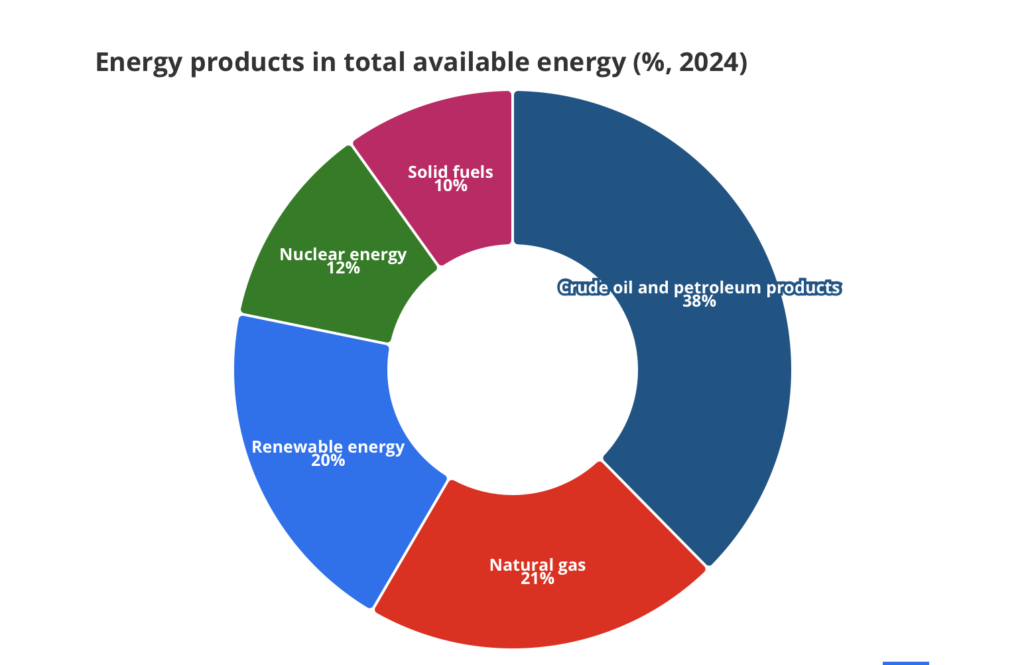 Struktura energjetike e BE-së dominohet nga nafta dhe produktet e saj me 38%, e ndjekur nga gazi natyror me 21% dhe energjia e rinovueshme me 20%. Energjia bërthamore renditet pas tyre, ndërsa karburantet e ngurta zënë rreth 10%.